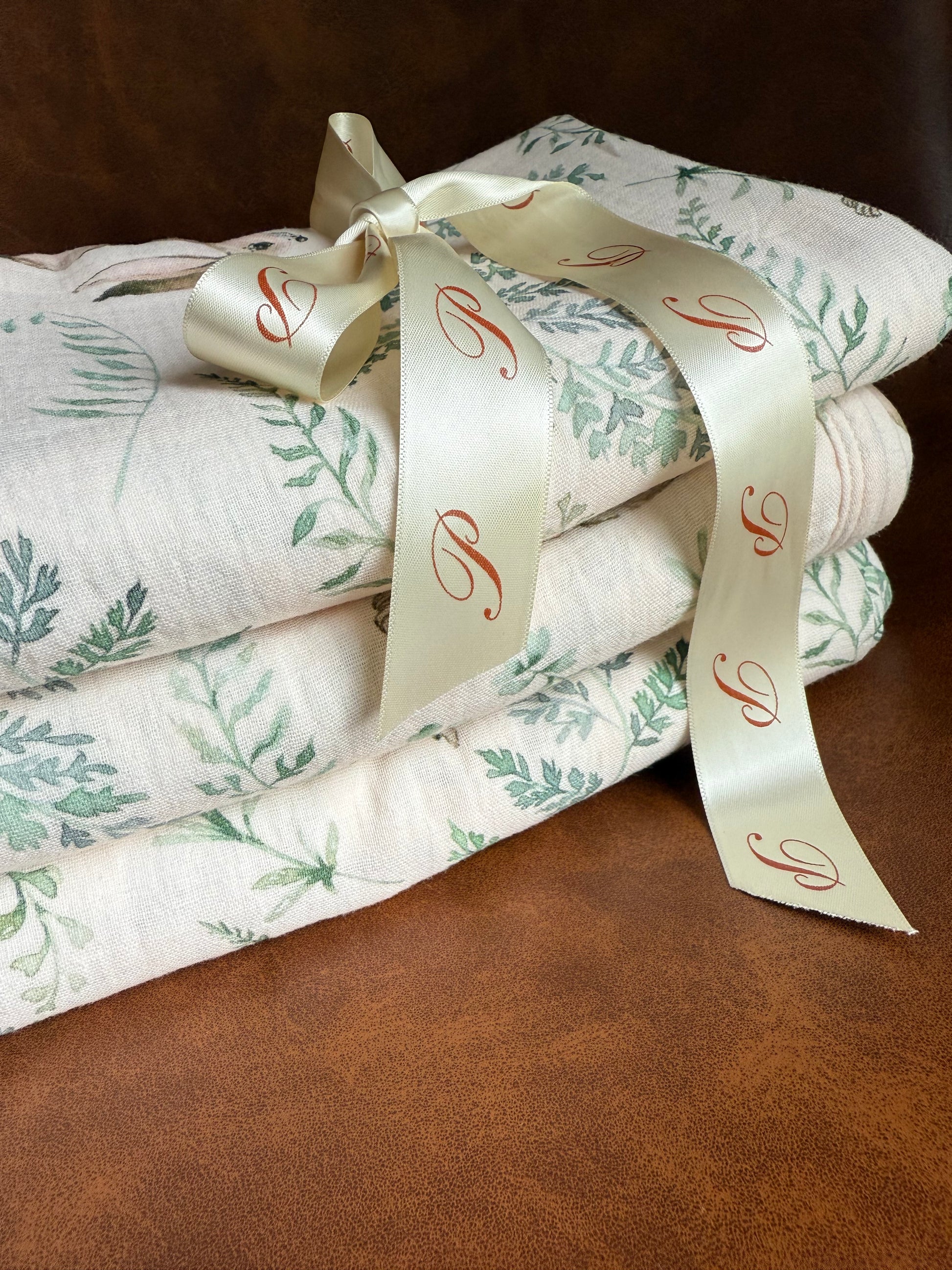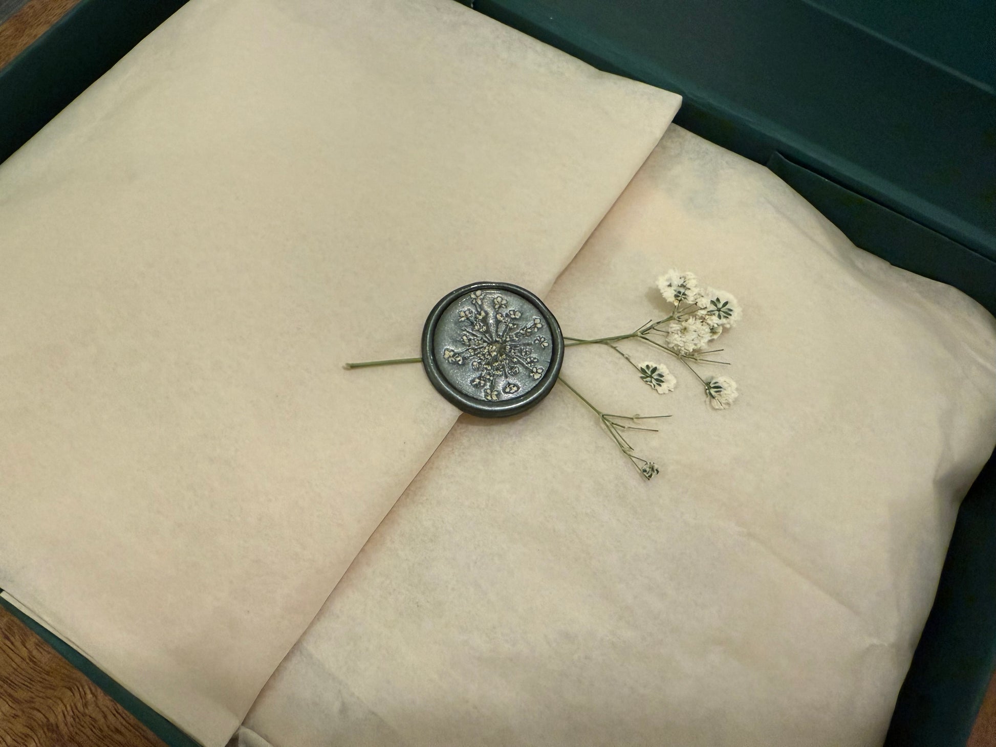 Your blanket will be wrapped in high quality, compostable tissue paper sealed with a wax seal containing a real Queen Anne's lace pressed flower. The gift box includes 100% pure silk hand-dyed ribbon, dried fern, and a handwritten message. This allows you to send your gift directly to your recipient.