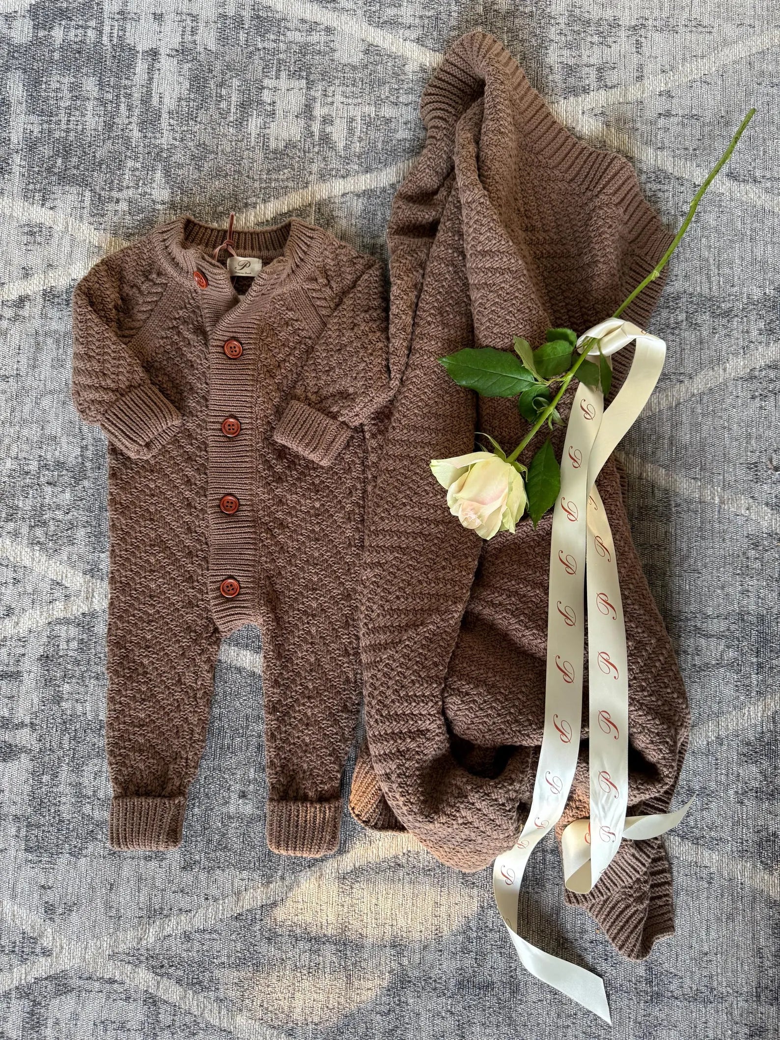 The organic cotton footless mocha romper in size 0-3 months (without a gift box). This simple, comfortable, and smart piece is perfect for a little one. It features a warm brown shade, wooden buttons that subtly stand out, and turned-over cuffs to finish this sophisticated knit romper.