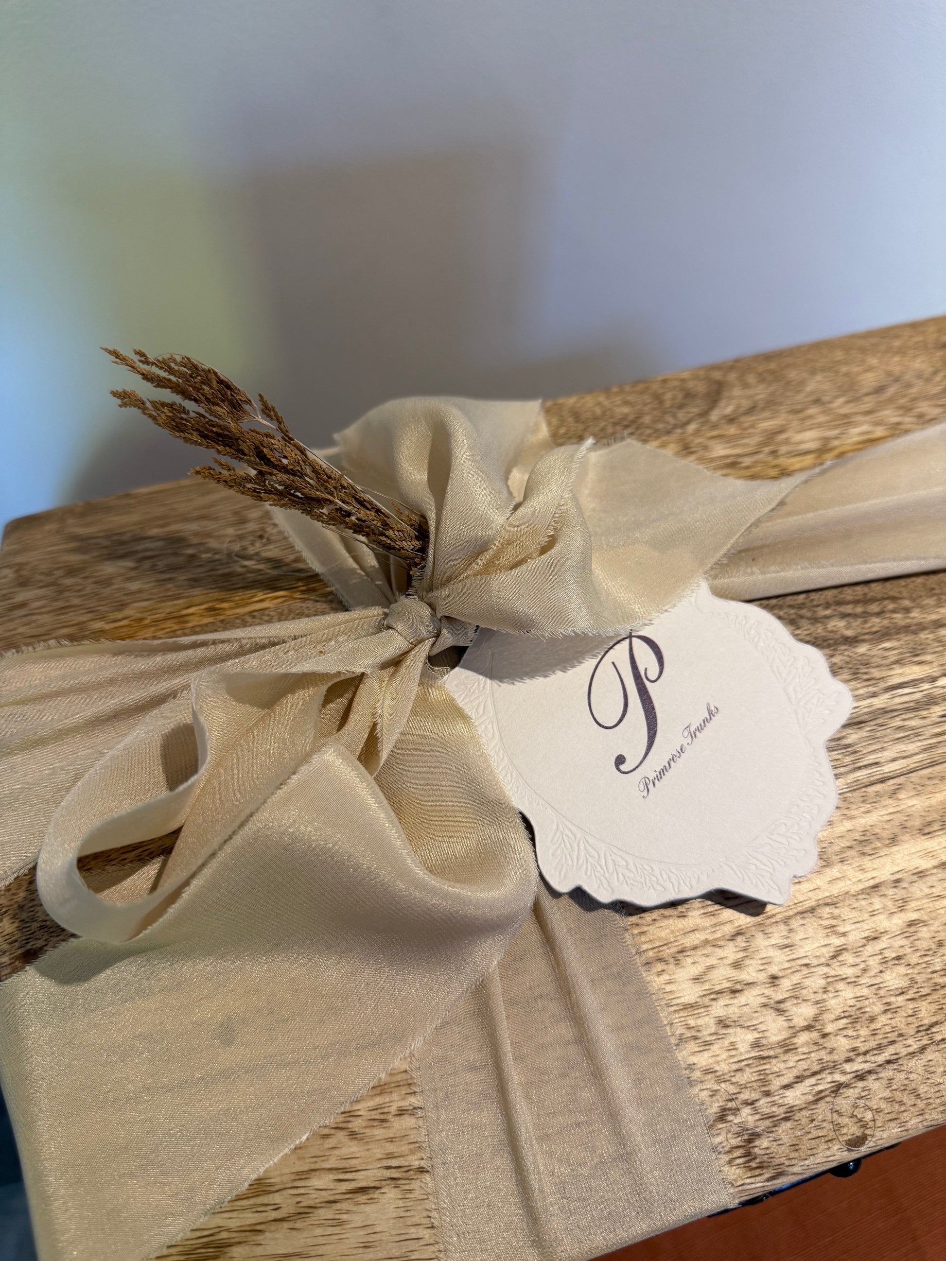 Choose between one or more products, which will be lovingly packed with ribbon, compostable, acid-free tissue paper, sealed with a real Queen Anne’s lace flower wax seal, and finished with hand-dyed silk ribbon in a choice of two colours.
