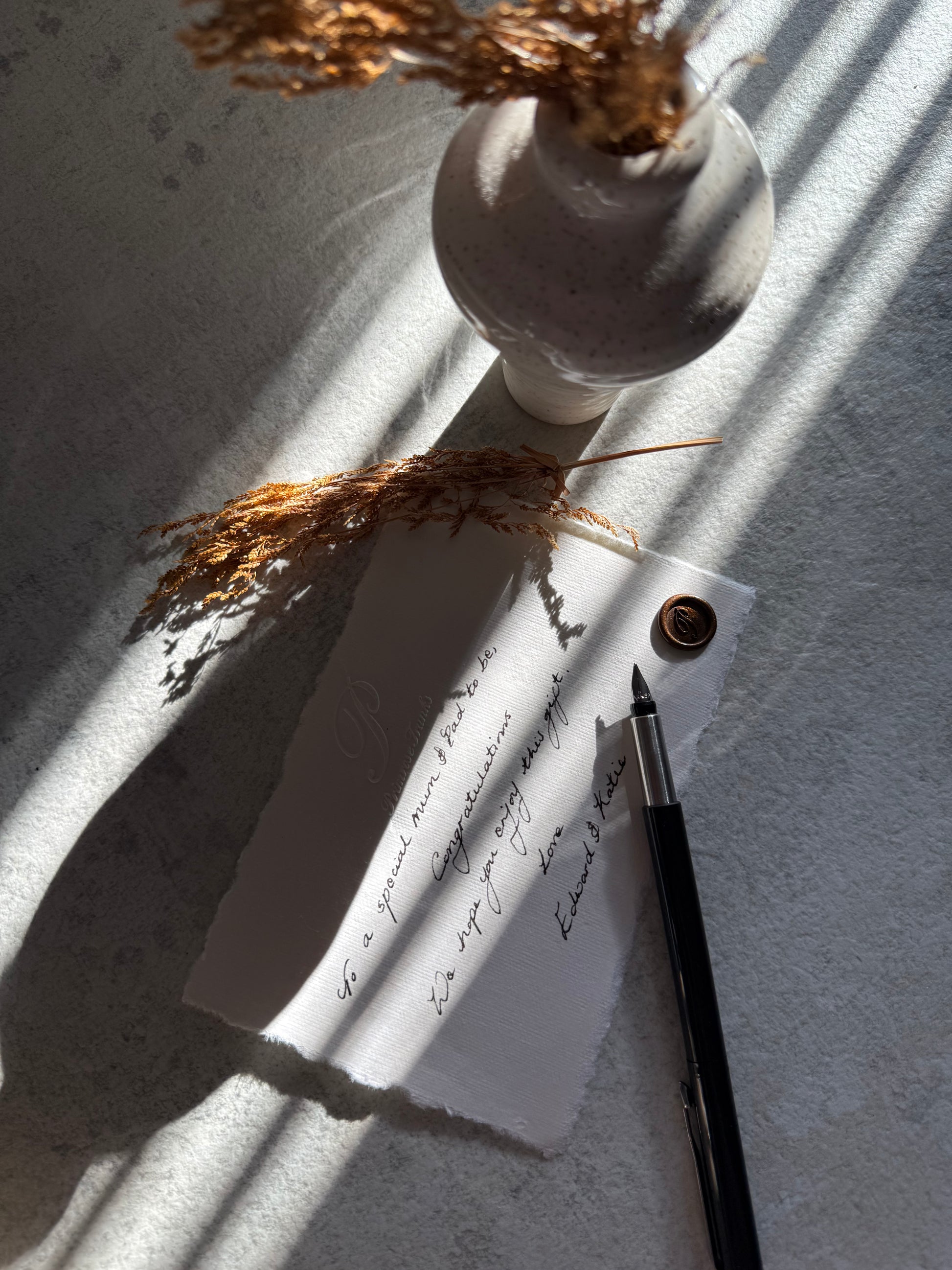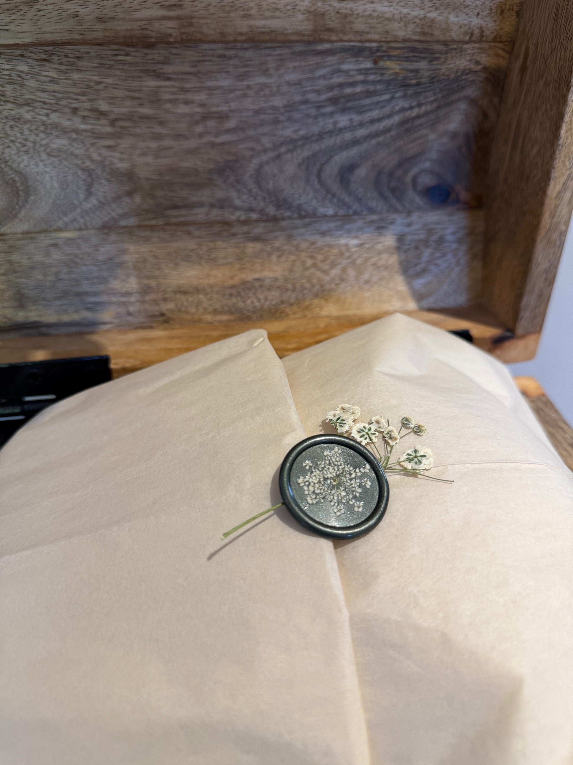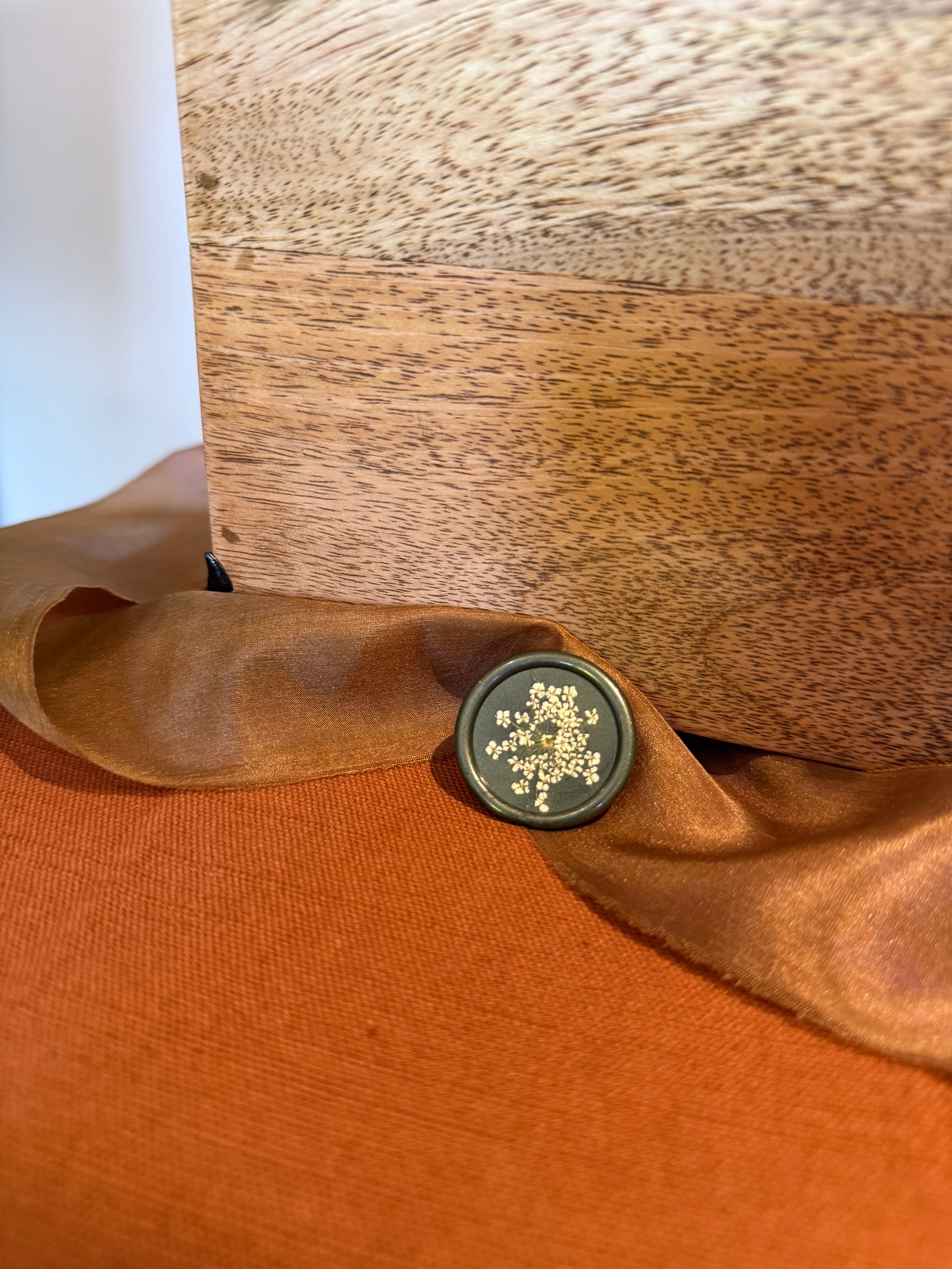 Choose between one or more products, lovingly packed with ribbon, compostable, acid-free tissue paper, a real Queen Anne’s lace flower wax seal, and hand-dyed silk ribbon in a choice of two colours.