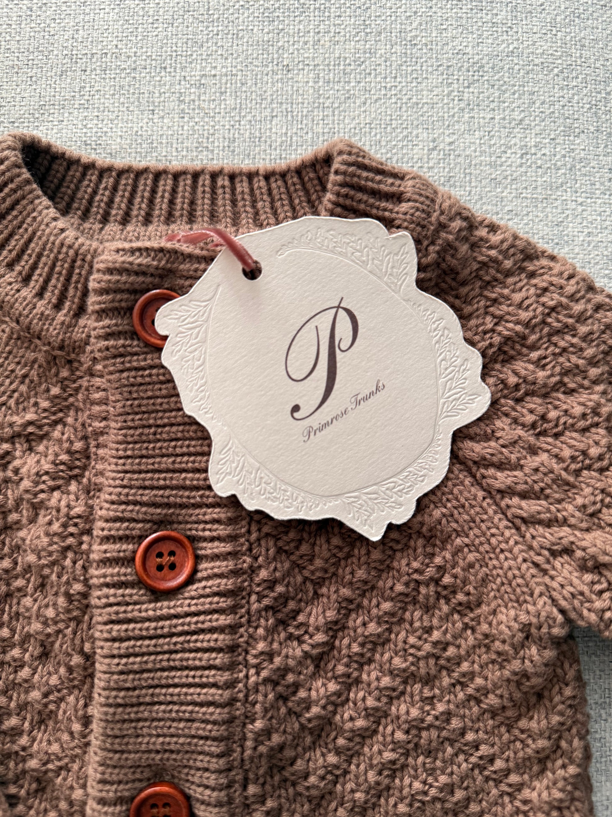 ~ Organic cotton mocha knit romper (size 0-3 Months) with the matching mocha knit blanket (approx. 90 x 90cm) and a large cotton fern & bunny muslin (approx. 110 x 110cm)