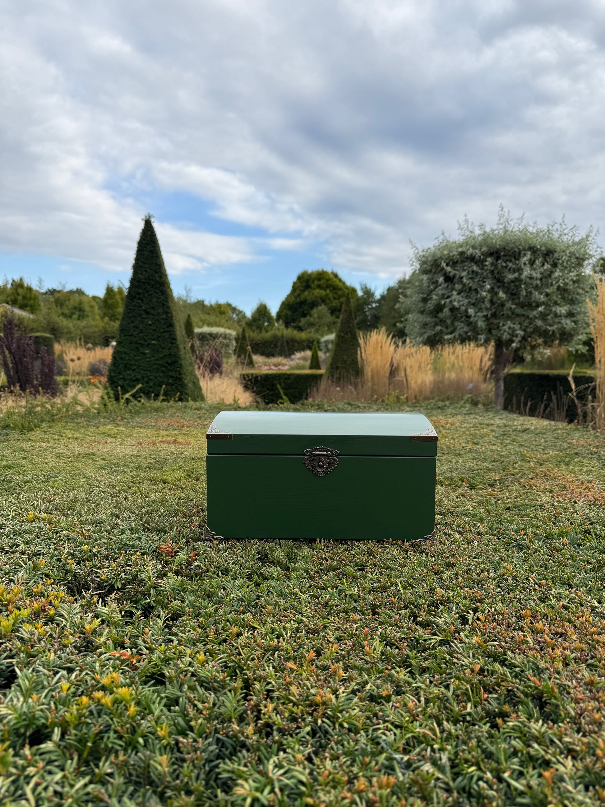 ~ Brunswick green Primrose Trunk with hand-dyed silk ribbon and dried fern. Soft brown velvet interior on the base of the trunk. Approx. measurements of the trunk - 35cm (W), 24cm (D), and 18cm (H)